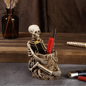 木の切り株を抱きしめる骸骨がユニークなペン立てです。