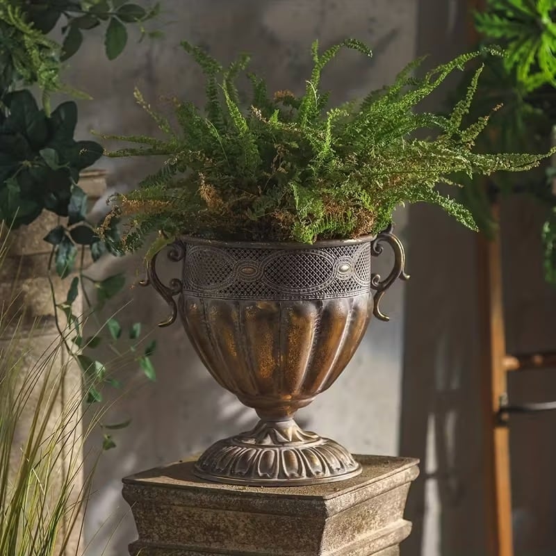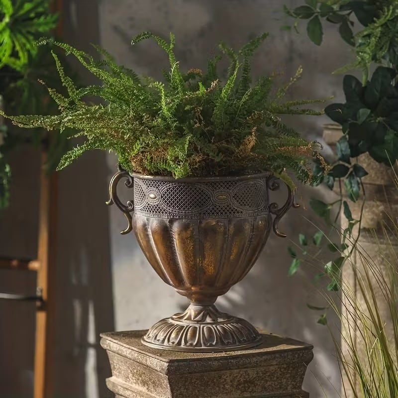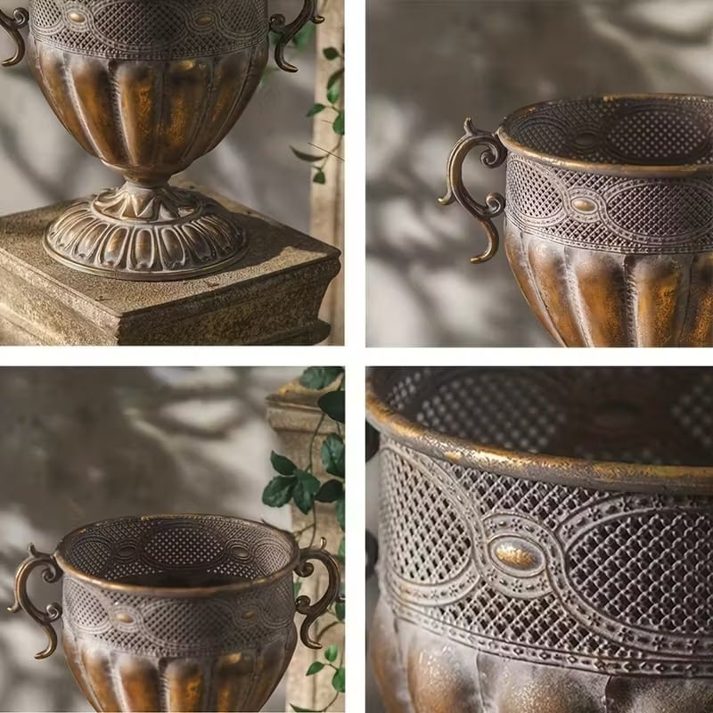 ヨーロッパの古城やクラシックな庭園に置かれていそうな、重厚感と優雅さが漂っているヴィンテージ調のプランターです。