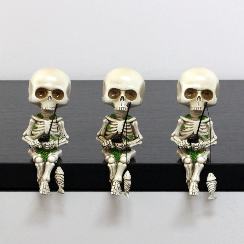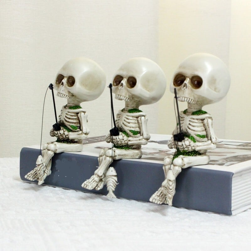 骸骨がのんびり釣りをしている姿のオブジェで、