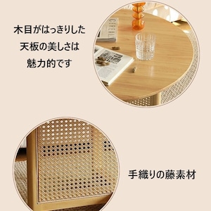 丸みのある天板と手編みの藤(ラタン)パネルが特徴で、ナチュラルな木目と編み込みのコントラストが美しく、空間に柔らかさとリズムを与えてくれます。
