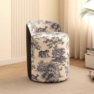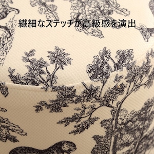 トワル・ド・ジュイ風のモノトーンプリントが施されており、玄関やリビングのアクセントとしても使いやすく、また、ダイニングチェアにも近い実用的なサイズになっています。