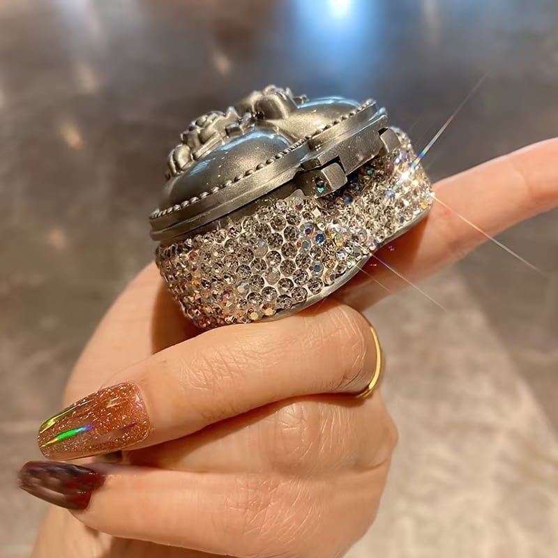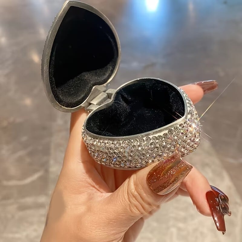 金属の光沢と側面のラインストーンが光を受けてきらめき、内側の黒いベルベットが宝飾品を引き立てるため、プレゼントやディスプレイ用途に適した見栄えです。