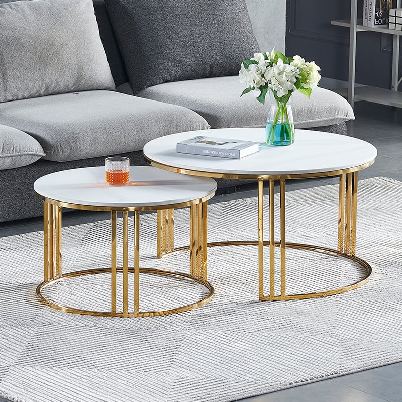 高級感あるデザインのコーヒーテーブル 大小2点セットです。大きい方は椅子の隣に、小さい方はソファの横に置く、という使い方も可能です。どんなお部屋にも合うシンプルかつモダンなデザインですので、お客様へのおもてなしにも最適です。一日の疲れを癒すために、今夜のコーヒータイムを、是非、ラグジュアリーな空間で過ごしませんか?