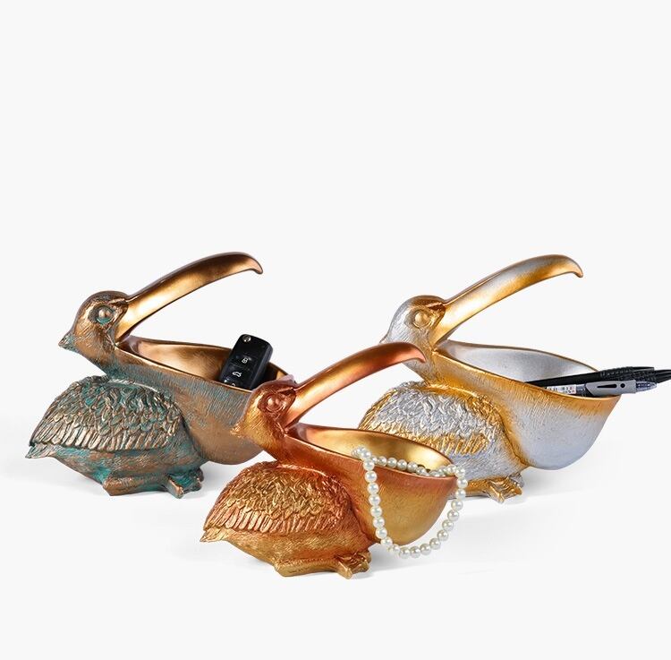 お部屋に華やかさと個性をプラスするアイテムです。また、ペリカンの口部分は収納スペースになっているので、小物や雑貨を収納することができます。玄関やリビング、寝室など、お好きな場所に飾ってお楽しみください。