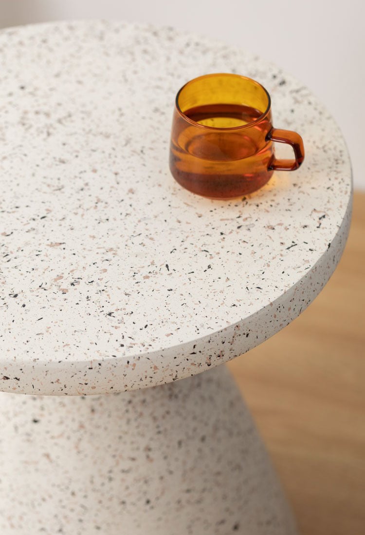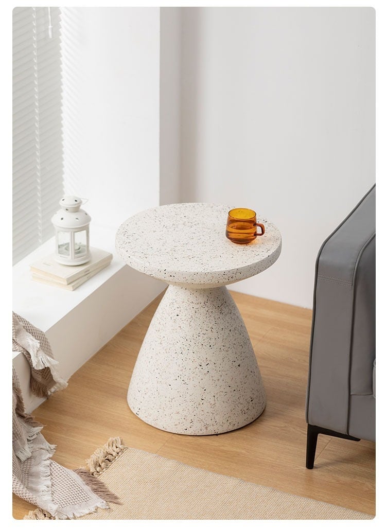 このシンプルなデザインのリビングルーム用ソファサイドテーブルは、小さな円形のテーブルでありながら、モダンで創造的な雰囲気を演出します。