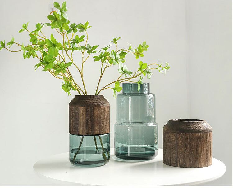 北欧の風を感じる天然木製の花瓶です。透明なガラス素材が上品さを演出し、インテリアにアクセントを与えます。