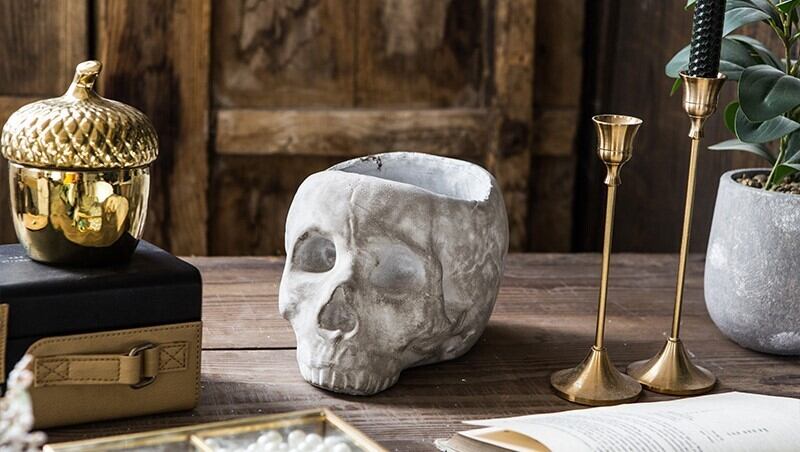 独自のデザインと存在感を持つスカル型の植木鉢オブジェです。セメント素材の堅固な造りと洗練されたディテールが特徴です。幅広い植物にマッチし、重量も約2.3kgと安定感があります。お部屋や庭にユニークな個性を加えたい方にぴったりのアイテムです。