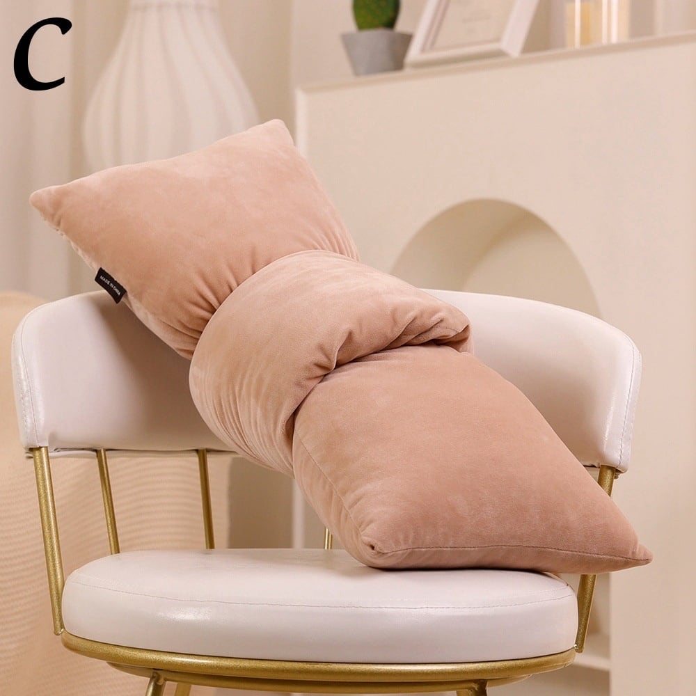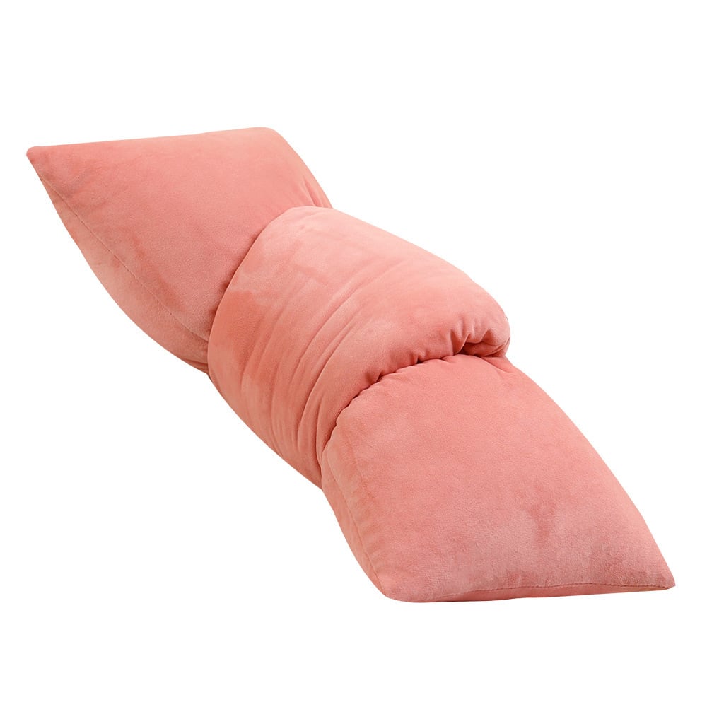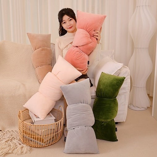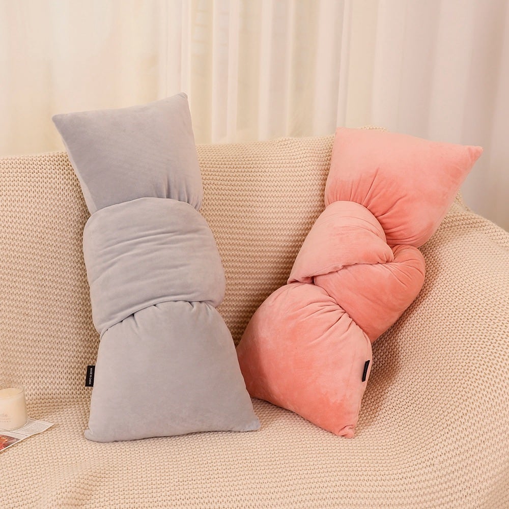 柔らかい素材でできた大きな結び目クッション。韓国や北欧のおしゃれなインテリアにぴったりのアイテムです。細長い形状と洗える素材なので、ソファやベッドにも自由に配置できます。キュートなデザインとやわらかな触り心地で、くつろぎのひと時を演出します。
