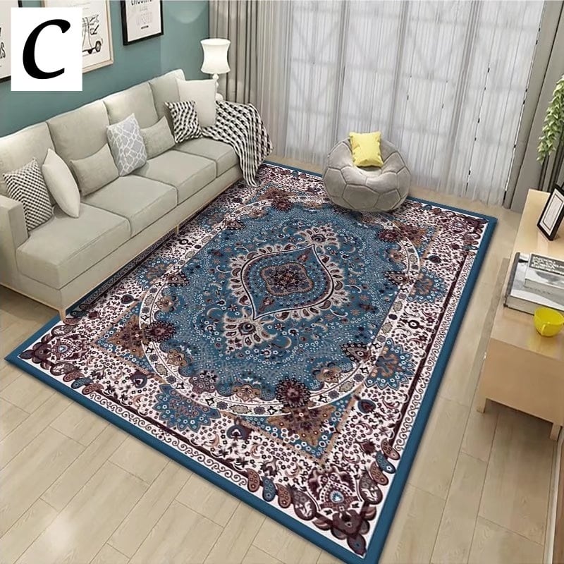ペルシャ風の美しい柄が特徴の絨毯です。リビングや寝室など様々な場所におしゃれなアクセントをプラスしてくれます。厚み6mmのしっかりとした作りのため、足触りも心地よく、長時間の使用でも疲れにくいです。滑り止め付きなので、安心してご使用いただけます。