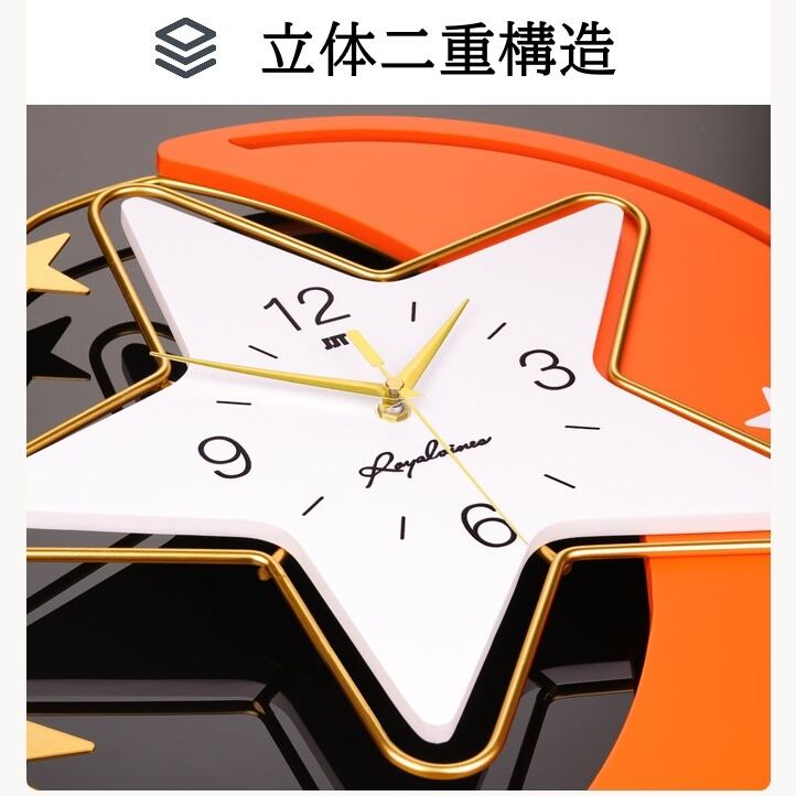 星と月 クロック 掛け時計 見やすい クリエイティブ オレンジ リビング おしゃれ インテリア 静か アナログ時計 振り子時計 電池式 静音設計