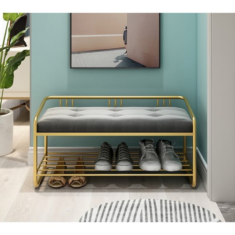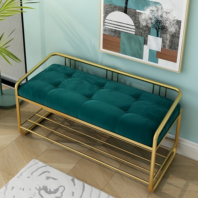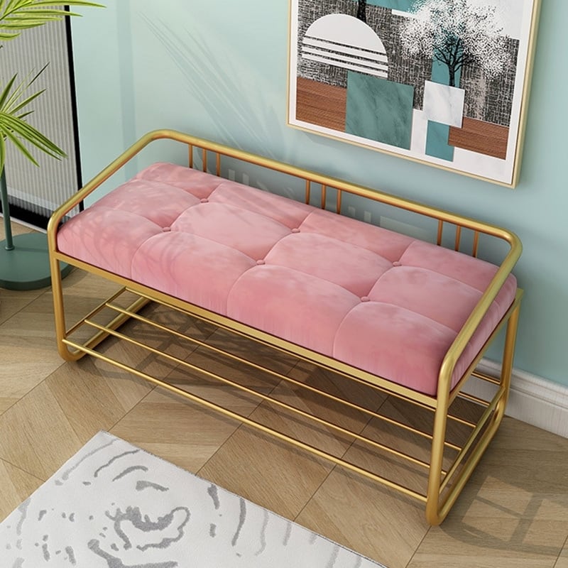 収納ラックが付いたベルベット調生地のロングスツールをご紹介致します。