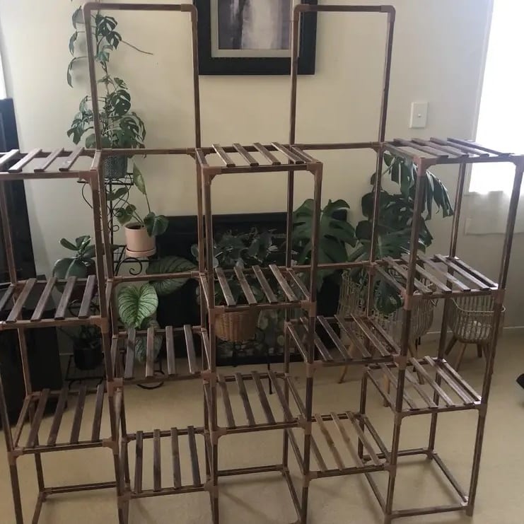 レトロでヴィンテージ感のある竹製の棚、プランターラックです。シンプルなデザインで、植物や花を飾るのに最適なアイテムです。5列の棚があるので、たくさんの植物を飾ることができ、庭やベランダ、屋内のリビングやダイニングなど、様々な場所に合わせて使えます。