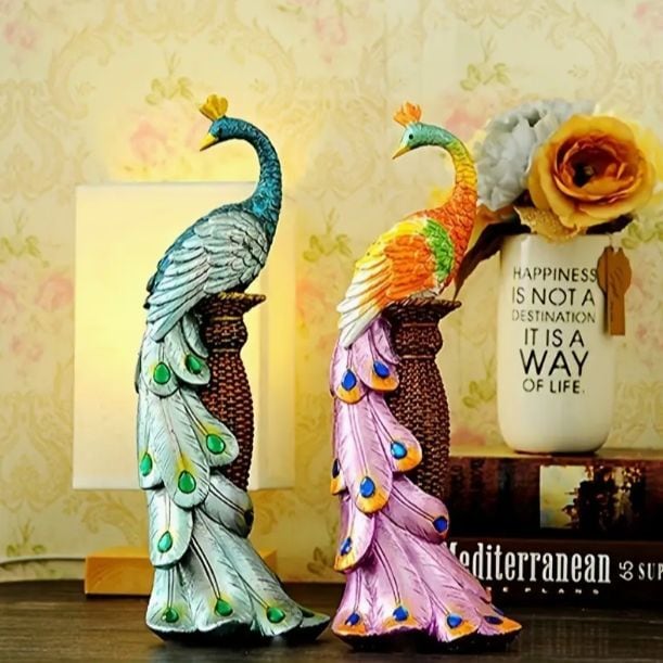 このクジャクの置物は、豪華で上品なリビングの装飾品として最適です。ゴージャスな色合いが部屋にアートのような華やかさをプラスしてくれます。クジャクの美しい羽根や優雅なポーズが、贅沢な空間を演出してくれます。