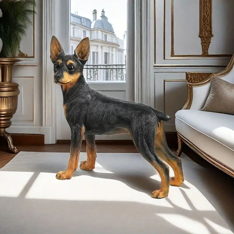 このオブジェは、まるで本物の犬のようなリアルな表情が魅力的なドーベルマンの置物です。