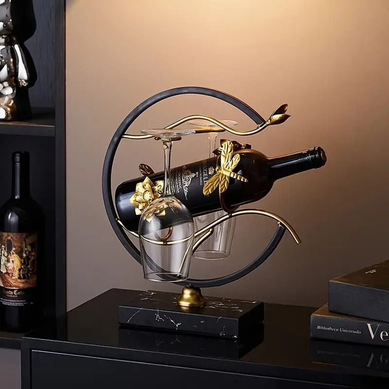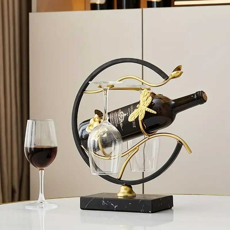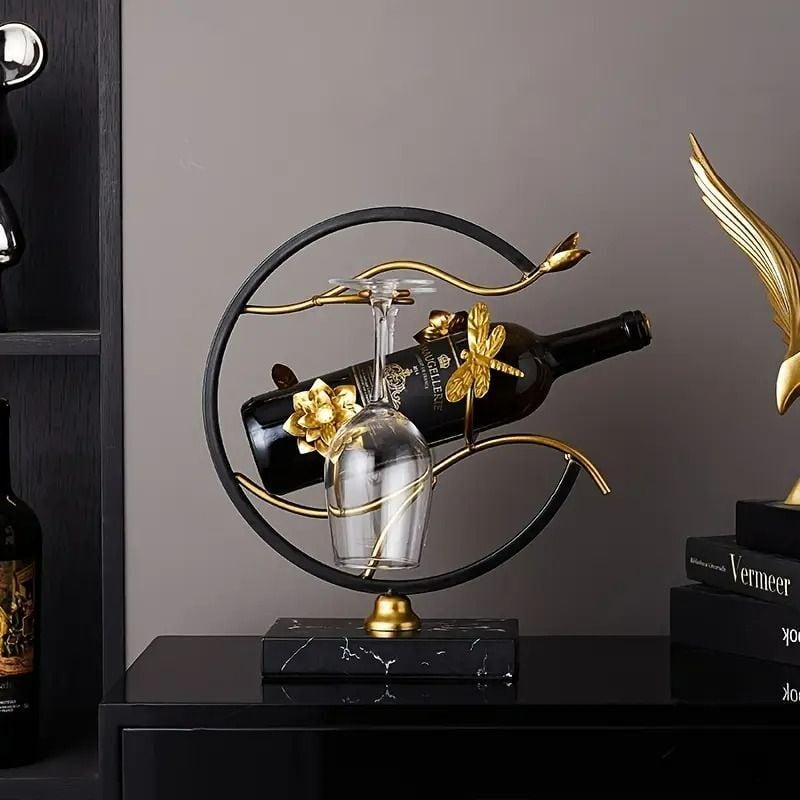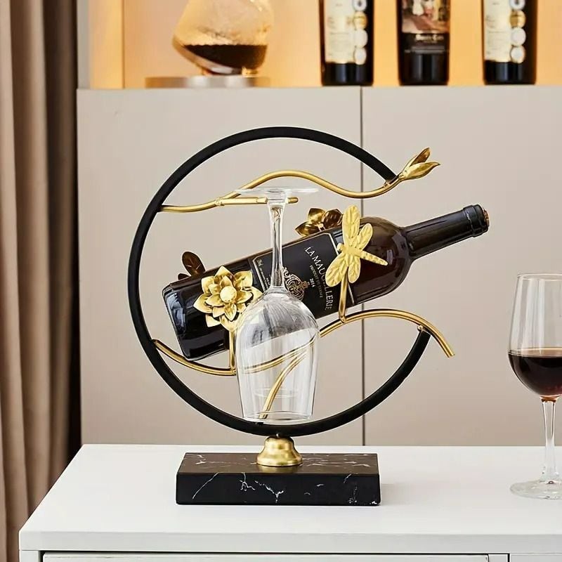 エレガントなデザインのメタル製ワインラック&グラスホルダー。シンプルながらも洗練された装飾が印象的で、どんなインテリアにも調和するスタイルを持っています。ワインボトルとグラス2本を美しく飾ることができ、特別な日を演出するアイテムとして活躍します。その存在感はお部屋にさらなる魅力を添え、ゲストを招く際の話題にもなることでしょう。