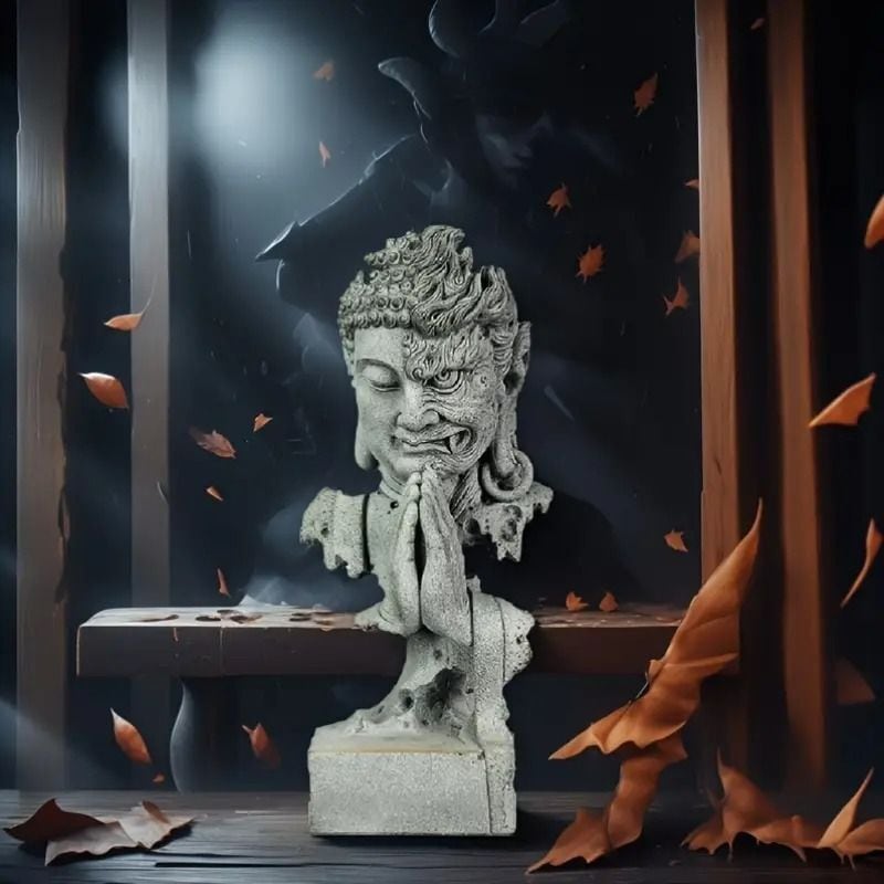 こちらのオブジェは、「天国と地獄の間」をテーマにした独特なデザインが特徴です。鬼と仏の二つの象徴的な存在が見事に融合したこのアイテムは、見る人に深い思索を促し、インテリアとしての存在感を放ちます。細部にわたる精巧な造りは、どんな空間にも特別な雰囲気を添え、リビングや書斎、オフィスでの装飾に最適です。