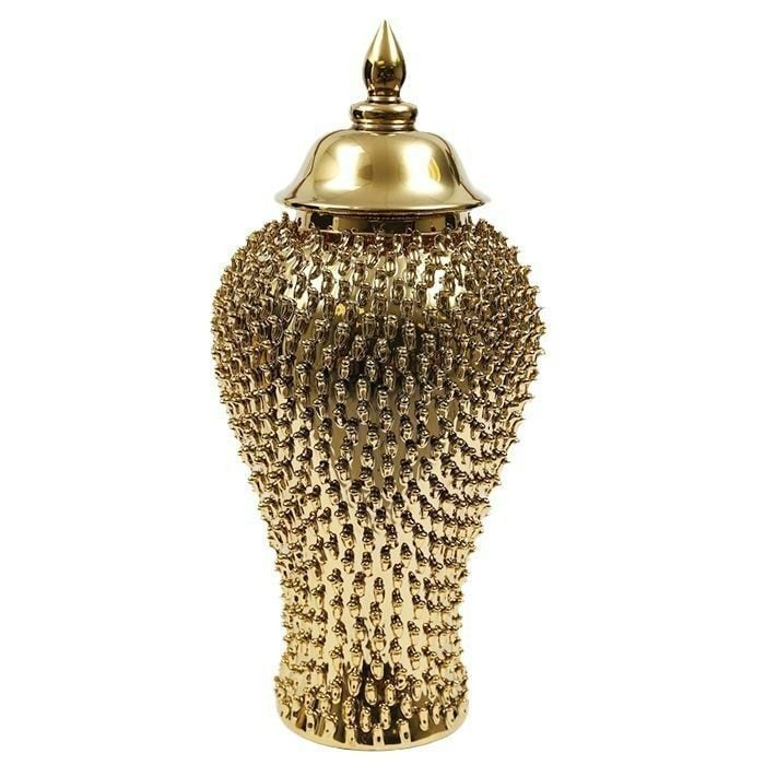 こちらの蓋つきボトルは、デザイン性と実用性を兼ね備えた魅力的なアイテムです。メッキゴールドの輝きが際立ち、どんなインテリアにも高級感を与えます!とげとげデザインが特徴的で、個性的なディスプレイが可能です。また、蓋つきのため、収納としても非常に便利です。おしゃれなお花や小物やアクセサリーを美しくディスプレイするのはもちろん、特別な場面でのギフトとしても喜ばれることでしょう。