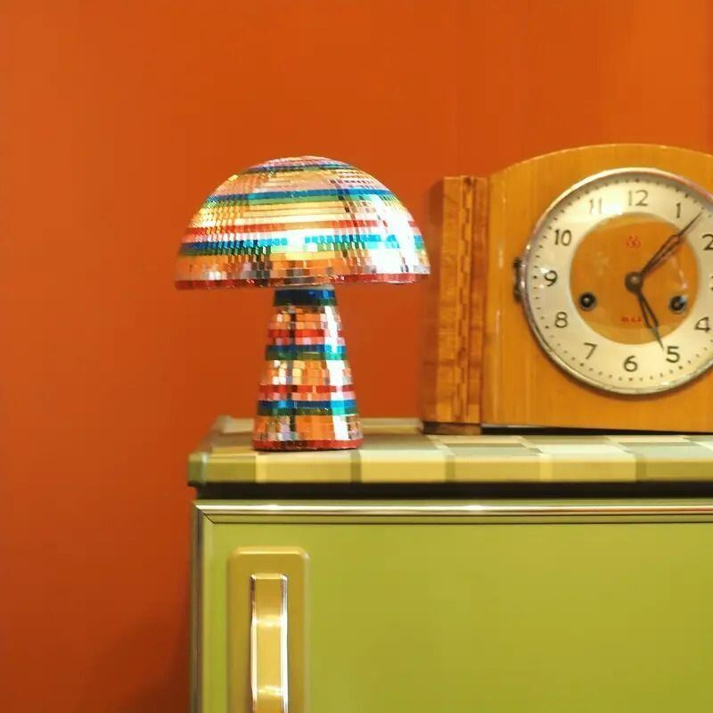 こちらのオブジェは、レインボーの色合いが美しいミラーボールのようなデザインが特徴的なマッシュルームのインテリアアイテムです。光を受けると、ミラーボールのように多彩な反射を生み出し、お部屋全体にキラキラとした雰囲気を演出します!どの空間に置いても、そのユニークなデザインが視線を集め、訪れる人々を魅了するでしょう。