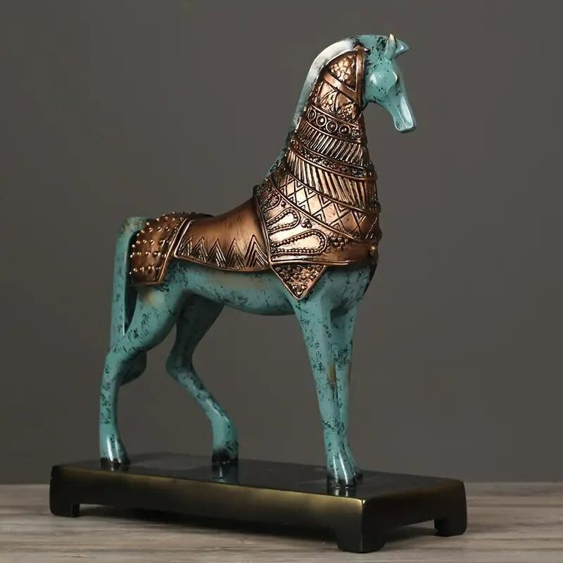 ブルーのボディにブロンズの鎧を装備したこの戦馬は、エレガントでありながら力強さも兼ね備えています。