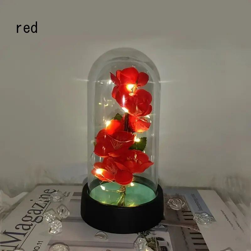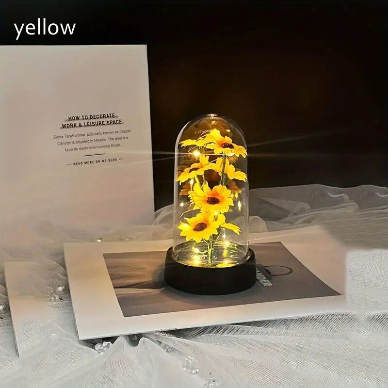 幻想的な光を放つプラスチックのドームに入った美しい花の置物です。